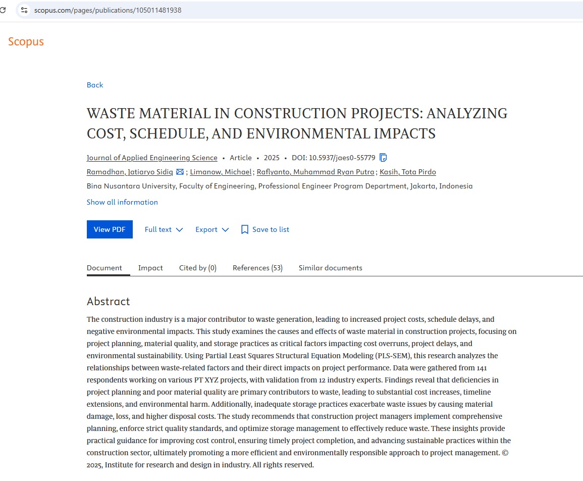 Congratulations for the publication of “WASTE MATERIAL IN CONSTRUCTION PROJECTS: ANALYZING COST, SCHEDULE, AND ENVIRONMENTAL IMPACTS” (Journal of Applied Engineering Science Scopus Index ) by Ramadhan Jatiaryo Sidiq, Limanow Michael, Putra Raflyanto Muhammad Ryan and Ir. Tota Pirdo Kasih, S.T., M.Eng., PhD, IPM